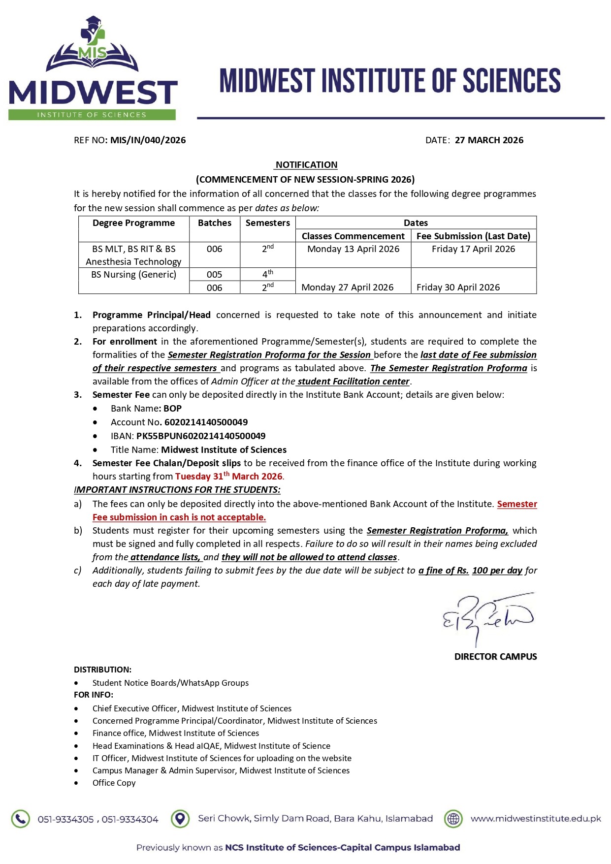 Notification for New Session BSN 005, 006 and BS Paramadics